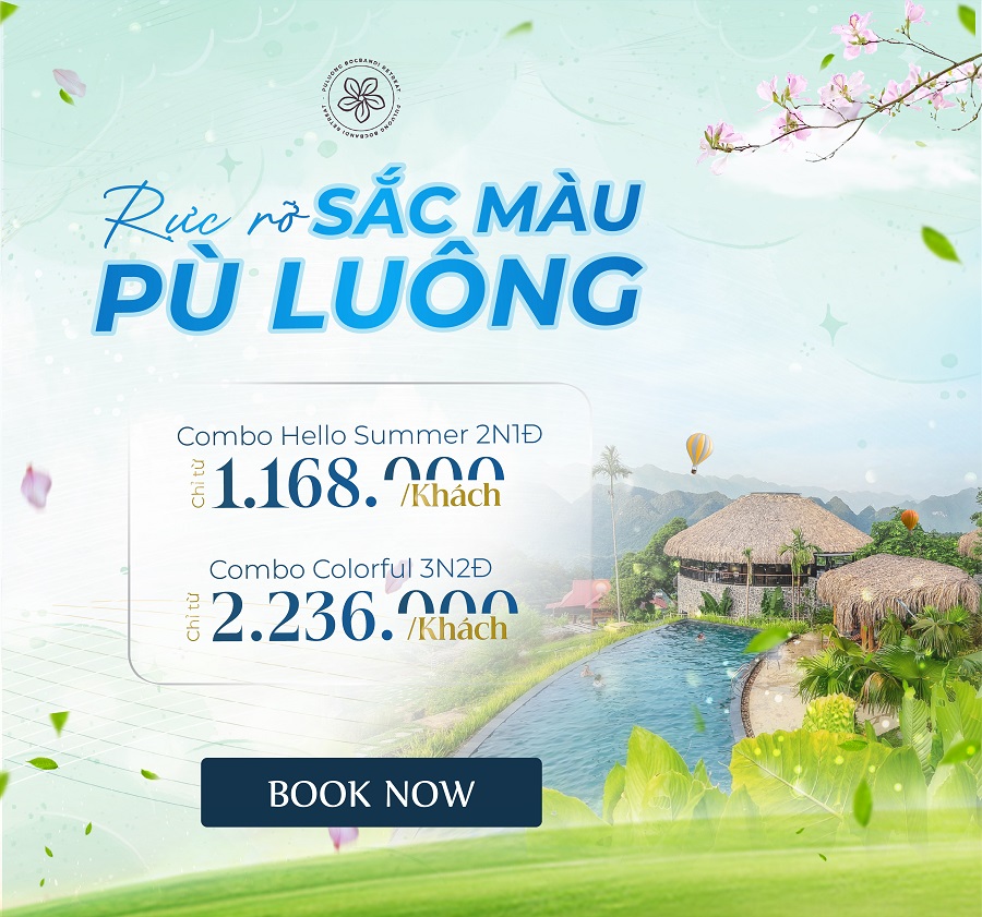 Combo 3N2Đ Hello Summer - Sắc màu Pù Luông ( hạng phòng Deluxe) Hướng thành núi và ruộng bậc thang, diện tích 88m2 Áp dụng cho 01 người lớn và miễn phí 1 bé dưới 5 tuổi Áp dụng cho hạng phòng Deluxe
